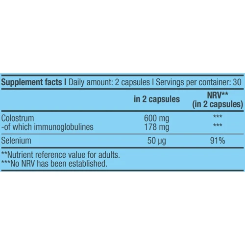 Суточная доза препарата составляет 2 мягких гелевых капсулы. В них содержится: 600 мг очищенного коровьего молозива; 50 мкг селена; целлюлоза, желатин, краситель, кремнезем, регуляторы кислотности и другие сопутствующие компоненты.