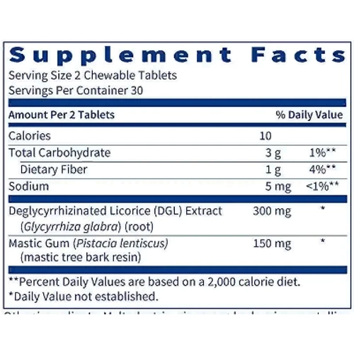 Поддержка пищеварения, Mastic Gum/DGL, Klaire Labs - это добавка в форме жевательных таблеток со вкусом корицы, которая содержит DGL (деглицирризинированный корень солодки) и мастичную камедь.