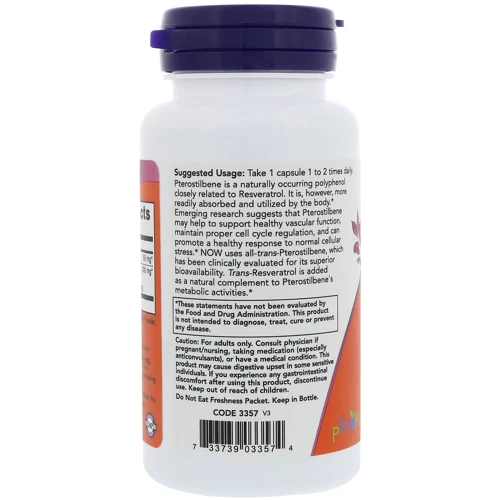 Птеростильбен является естественным полифенолом, тесно связанным с ресвератролом. Тем не менее, он более легко усваивается и используется организмом. Новые исследования показывают, что птеростильбен может способствовать поддержке здоровой функции сосудов, поддерживать правильное регулирование клеточного цикла и здоровую реакцию клеток на нормальный стресс. Компания NOW использует все переходные формы птеростибена, который получил высокую клиническую оценку за свою превосходную биологическую доступность. Транс-ресвератрол добавляется в качестве натуральной добавки для улучшения метаболической активности птеростильбена.