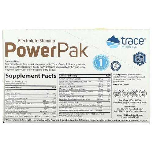 Электролиты со вкусом ананас и кокос Trace Minerals Research Electrolyte Stamina Power Pak это специальная смесь эфирных электролитов, в которых нуждается организм в период физических нагрузок. Необходимая смесь для пополнения организма всем важным в период и после занятий интенсивным спортом. Продукт служит для восполнения оптимального уровня энергии, выносливости и гидратации во время соревнований или при любой напряженной деятельности. Формула содержит основные электролиты (калий, магний, хлорид и натрий), которые ускоряют усвоение и поглощение витаминов и питательных веществ из продуктов. Дефицит любого из этих электролитов или их дисбаланс может вызвать много проблем в состоянии организма, в том числе: медлительность, усталость, снижение энергии, появление судорог.